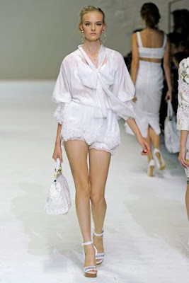 In addition to not-so-virginal wedding-night lingerie, which the models wore for the characteristically showstopping finale, theDolce & Gabbana girl's trousseau was stuffed with bedspreads, tablecloths, and curtains transformed into the duo's familiar hourglass sheaths, sexy skirtsuits, baby-doll dresses, rompers, and not a few va-va-voom corsets. Out they came in broderie anglaise, what looked like antique hand-tatting and crochet, a velvet floral, and, because it would hardly be a Dolce & Gabbana outing without it, leopard print. To finish: more lace smothered in clear crystals for a sparkling evening look.