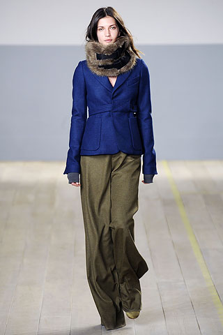 You could see references to Bonnie Cashin, who designed clothes for Coach in the sixties, in the leather-edged outerwear; to Joseph Beuys in the felt coats; and to Krakoff's passion for industrial design in the gunmetal hardware and the different shades of gray he used. Creating a design vocabulary from absolute zero, though, is not without its challenges, and with its military-meets-minimal look, something in the mood of the show echoed Phoebe Philo's influential Spring collection for Celine. That quibble aside, there was lots to like. On the way out, everyone was whispering approvingly of the long midnight blue coat that topped a gray cardigan and extra-wide ivory moleskin pants. But Krakoff's chunky knits also deserve shout-outs, and so do a pair of shearling jackets. Those had a swagger the designer can build on next time.